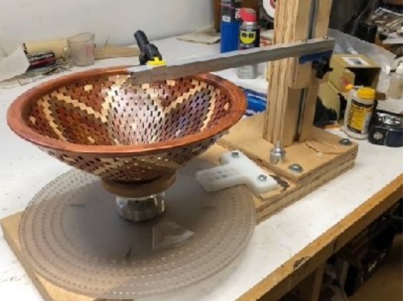 At Buddy’s place, things get created in his basement shop of approximately 700 square feet. He has a nicely equipped shop with: a 1.75 hp Sawstop tablesaw, Powermatic (PM) shaper with power feed, 15″ PM planer, PM mortiser, 8″ Bridgewood jointer, 14″ Jet bandsaw, 6″ belt and 12″ disk sander by Delta, 17″ Delta drill press, 3 hp Triton router in a router table, and a dust collector. His lathe is a Nova Galaxy DVR 16″ swing unit conveniently placed in the back of the shop. All accessories like turning tools, grinder and vacuum pump are all handy within arms length of where they are needed. Buddy is using a grinder with a classic setup of one CBN wheel on one side, and on the other side is a traditional grinding stone with a Wolverine tool sharpening setup.