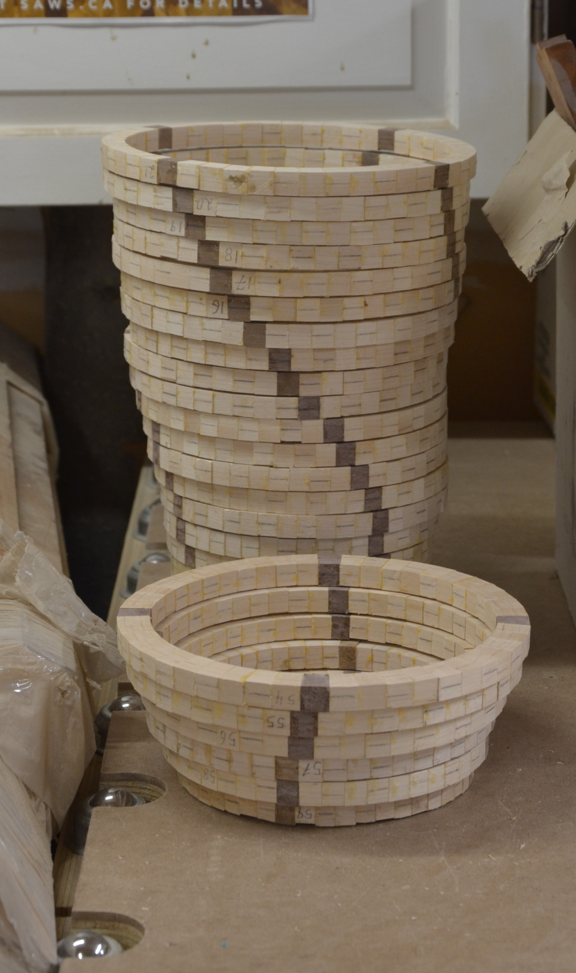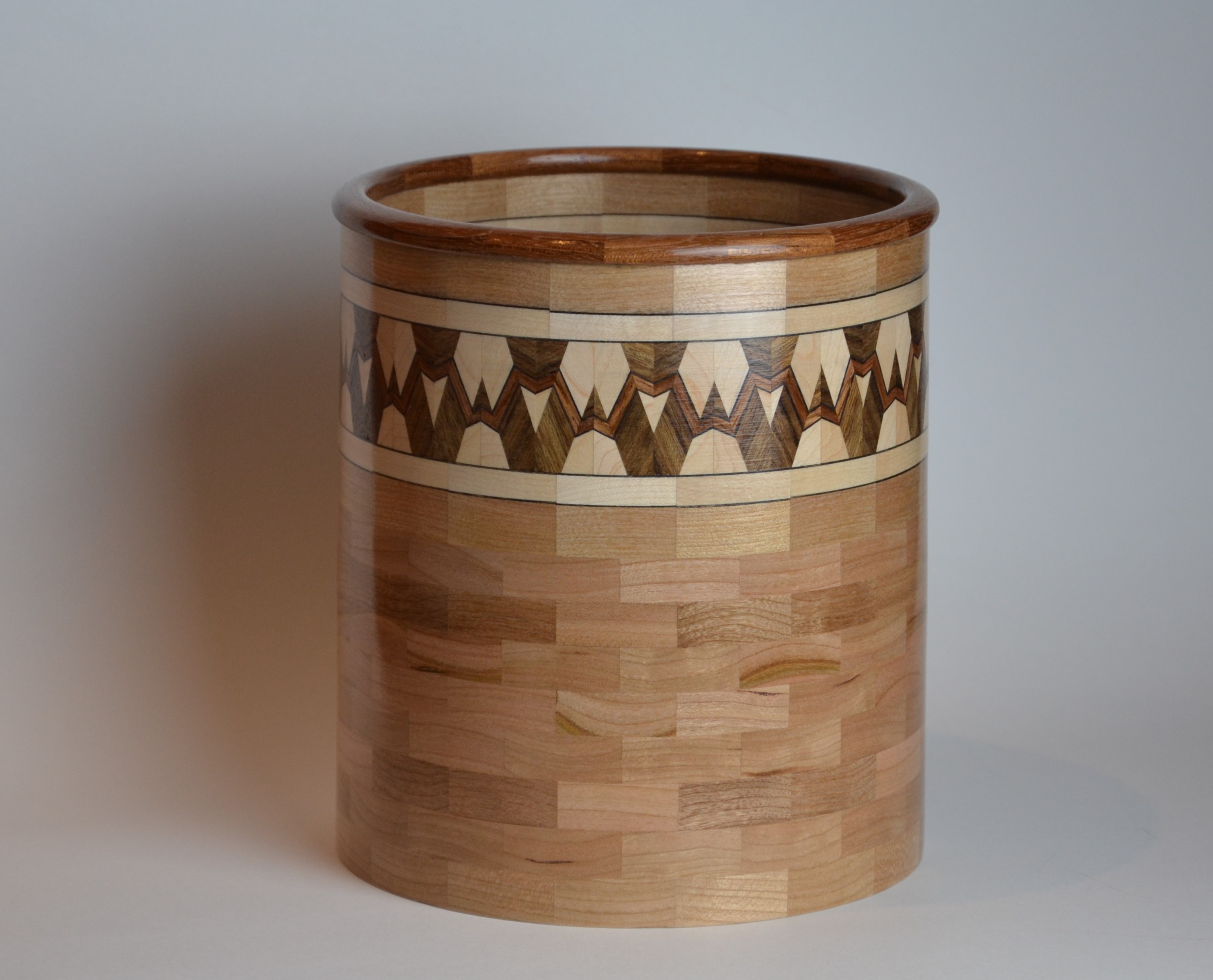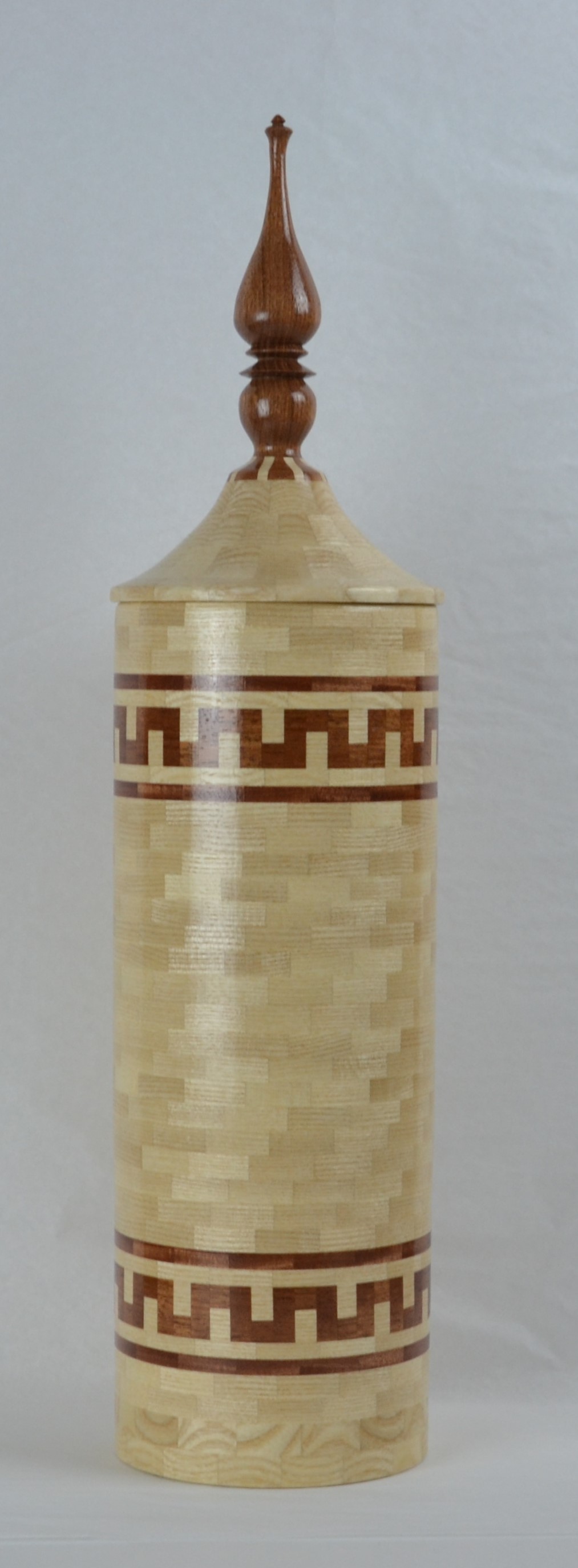 I’m constantly trying new techniques, experimenting, different shapes, and challenging myself. Currently working on a 60 ring 2,880 piece, 30” tall vase (largest turning I’ve done to date). At the same time, I am working on a pedestal cookie jar (that will have a hidden compartment for chocolates). While glue is dying on both of those projects, I’ll be working on a wine cabinet for the family room (furniture project, not turned). I usually have two or 3 projects on the go at the same time. In the planning stages is a piece inspired by a huge Greek urn I saw in the Napoleon’s Bedchamber portion of the Louvre. I am planning on a fourth generation lamination (thanks Lloyd Johnson for the software) as part of the feature ring. Also planned is a wooden gear clock.