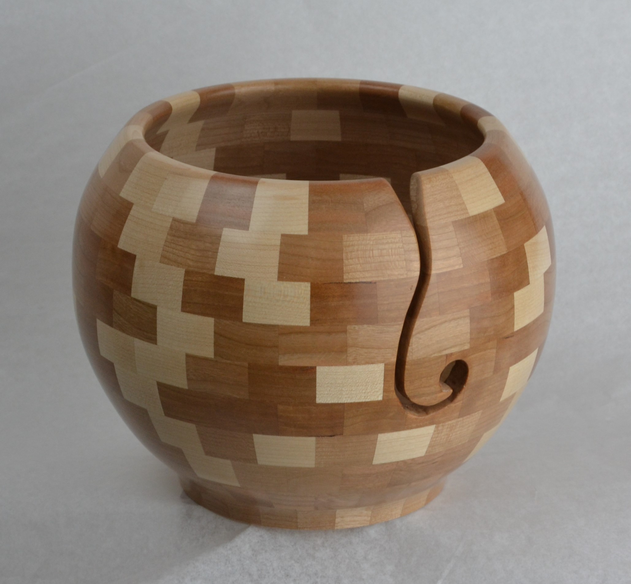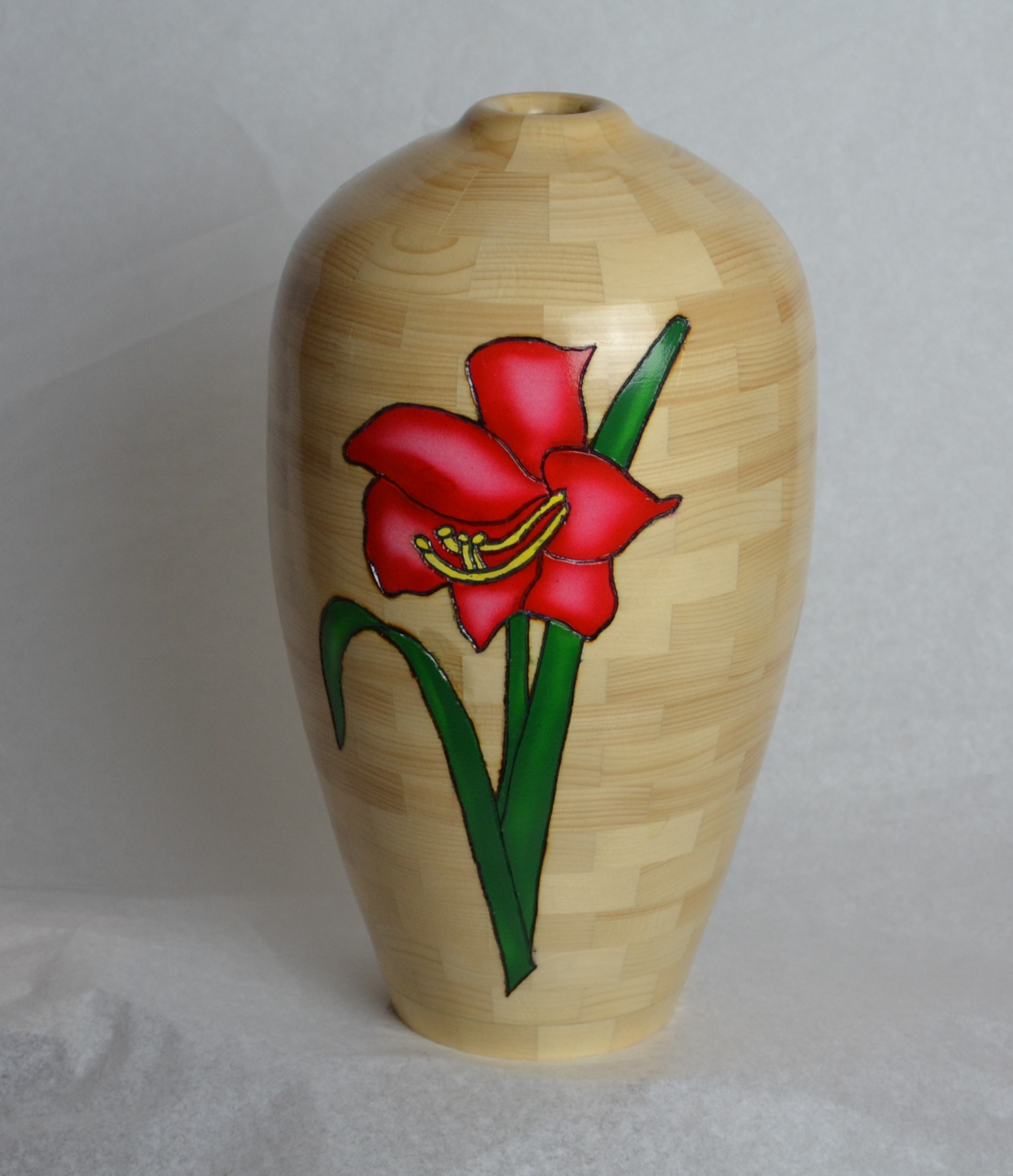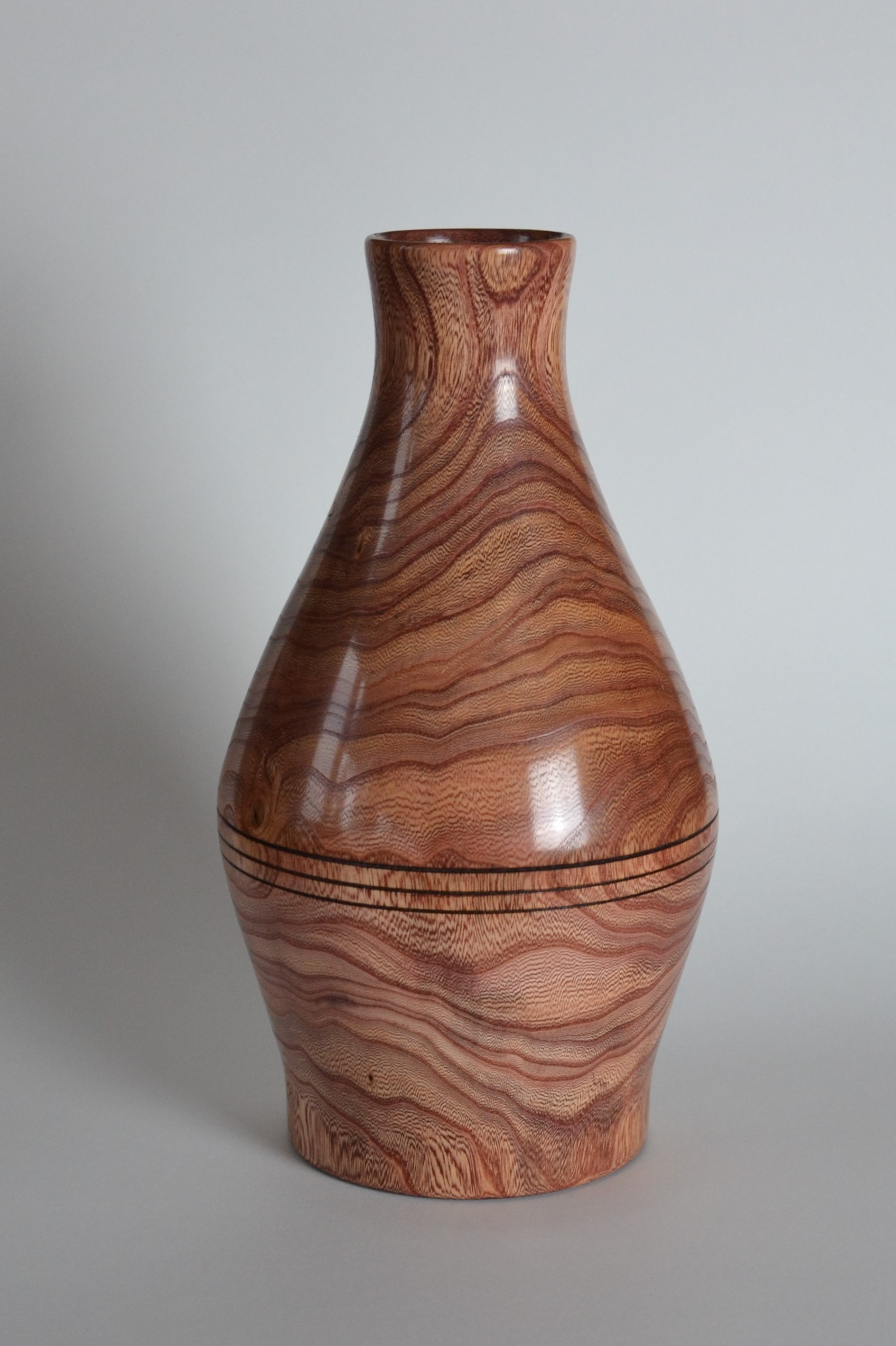 I’m constantly trying new techniques, experimenting, different shapes, and challenging myself. Currently working on a 60 ring 2,880 piece, 30” tall vase (largest turning I’ve done to date). At the same time, I am working on a pedestal cookie jar (that will have a hidden compartment for chocolates). While glue is dying on both of those projects, I’ll be working on a wine cabinet for the family room (furniture project, not turned). I usually have two or 3 projects on the go at the same time. In the planning stages is a piece inspired by a huge Greek urn I saw in the Napoleon’s Bedchamber portion of the Louvre. I am planning on a fourth generation lamination (thanks Lloyd Johnson for the software) as part of the feature ring. Also planned is a wooden gear clock.