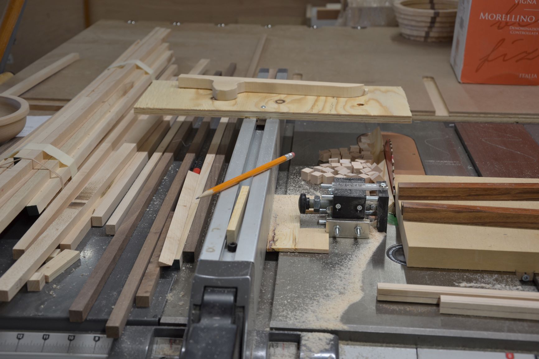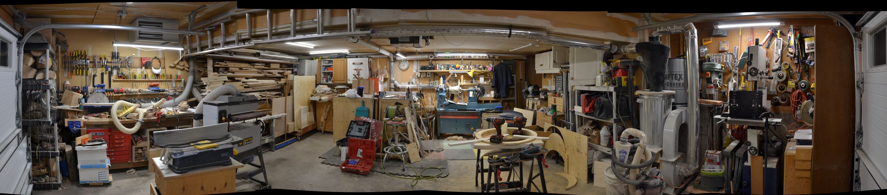 My shop is an oversized double car garage that the cars do come home and spend the night in. When the cars are away, the tools come out to play. When the cars are home, I still have room (just enough, not much extra) to cut segments and turn in front of the cars. All tools are on wheels (with the exception of the lathe and the work bench). A plus considering the winters we get in Canada. Upgrade this year was a new insulated garage door. That with the gas heater I had installed a few years ago keeps me warm enough to turn year-round. My table saw is raised up so the top is 41 inches from the floor. My back thanks Malcom Tibbetts for this idea.