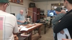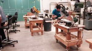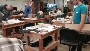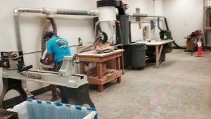 I have attached some photos of my class in action. The Woodworking department at Cerritos College is a 30,000 sq ft facility with 14 labs and classrooms. The turning lab has 24 Jet mini lathes, a Laguna 18 lathe, a nova lathe, a Sawstop table saw, 2 12” disk sanders, a 20” disk sander, and 3 chop saws along with all the other required tools. My segmented turning class meets on 14 Sundays from 9 to 4 with 19 students and a teaching aid. The objectives of the class are 1 SAFETY, 2 having a good time, 3 develop a love of segmenting. It must be working since I have never had a major accident and the students keep coming back. The class has about 75% returners and 25% first timers.